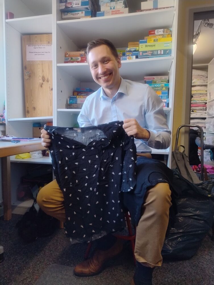 Vor Ort unterstützte er das Team im Second-Hand-Laden bei alltäglichen Aufgaben wie dem Auspacken und Sortieren von Spenden. Dabei wurde deutlich: Der Laden ist weit mehr als ein Ort zum Einkaufen. Für viele Familien – darunter auch zahlreiche Geflüchtete – ist er ein wichtiger Treffpunkt und niedrigschwelliger Zugang zu weiteren Unterstützungsangeboten. Hier entstehen Kontakte, über die Beratung, Hilfeleistungen und pädagogische Angebote oft erst möglich werden.